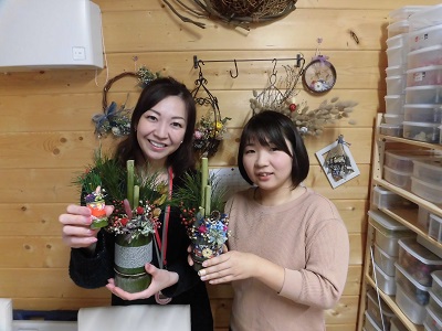 自宅の裏山にある竹と松、そして自分の農家で栽培している花で作ったドライフラワーを使って作ります。