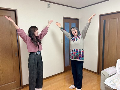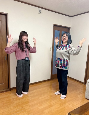 スタジオの亜弥子さんと一緒に両手でポーズを作りながら声を出して笑う「Ⅴ・W・T笑い」をやってみました!