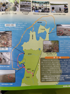 2018年と2019年に{GPSを搭載した海洋ごみ調査}を実施しました。GPSを搭載した模擬ごみを県南域の雄物川、県北域では米代川の上流、中流、下流から放流し追跡調査を行い、県域海岸でも一部フロートが回収されましたが、海洋へ流れ出たフロートは日本海の対馬海流にのって津軽海峡を通り、津軽半島や下北半島、八戸市の海岸まで流れ着き回収されました。